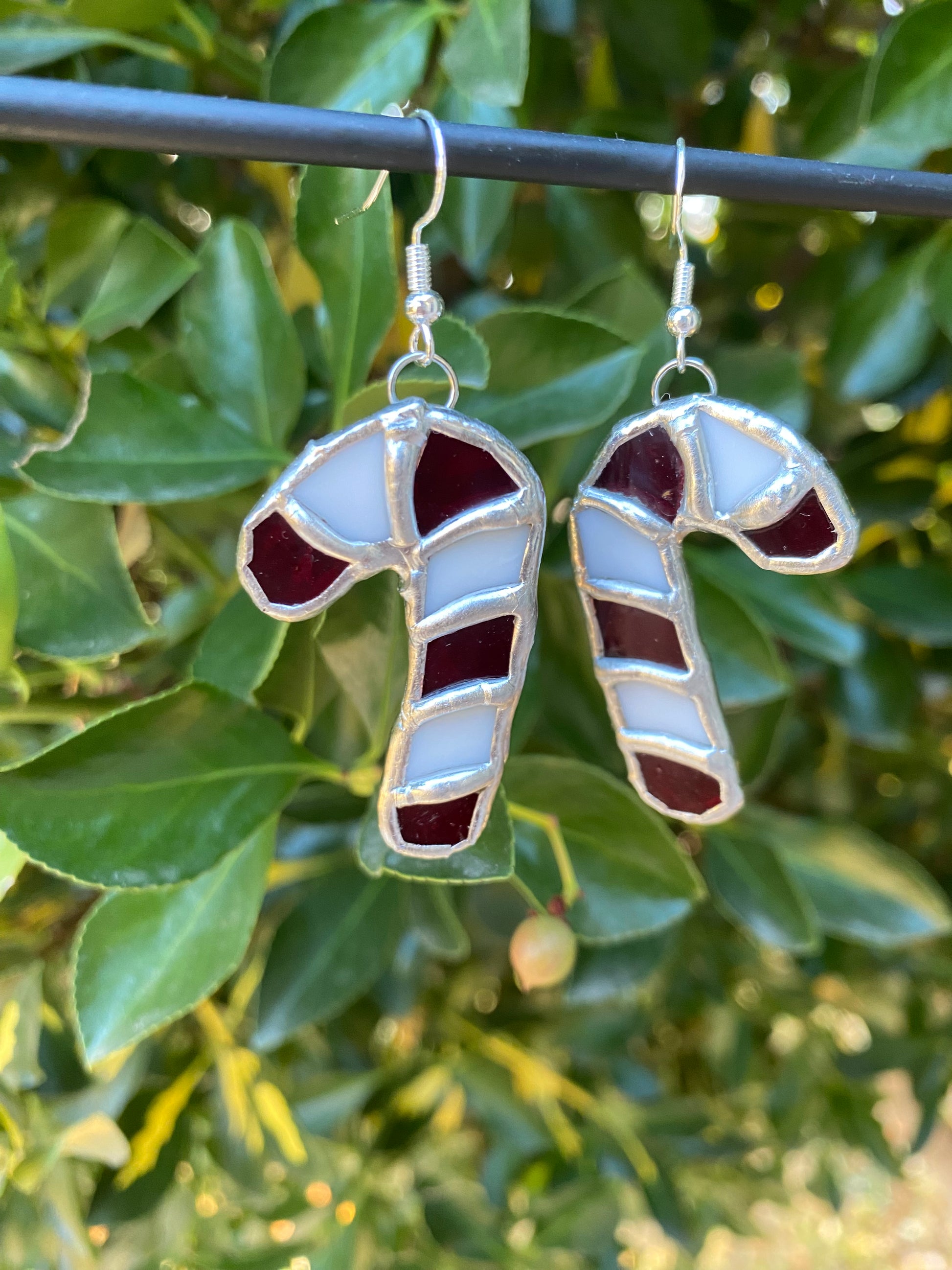 Festive stained glass candy cane earrings that bring holiday cheer to any outfit. Hand-crafted with red and white details, these lightweight earrings are perfect for seasonal celebrations or year-round nostalgia. A unique accessory that sparks conversation.