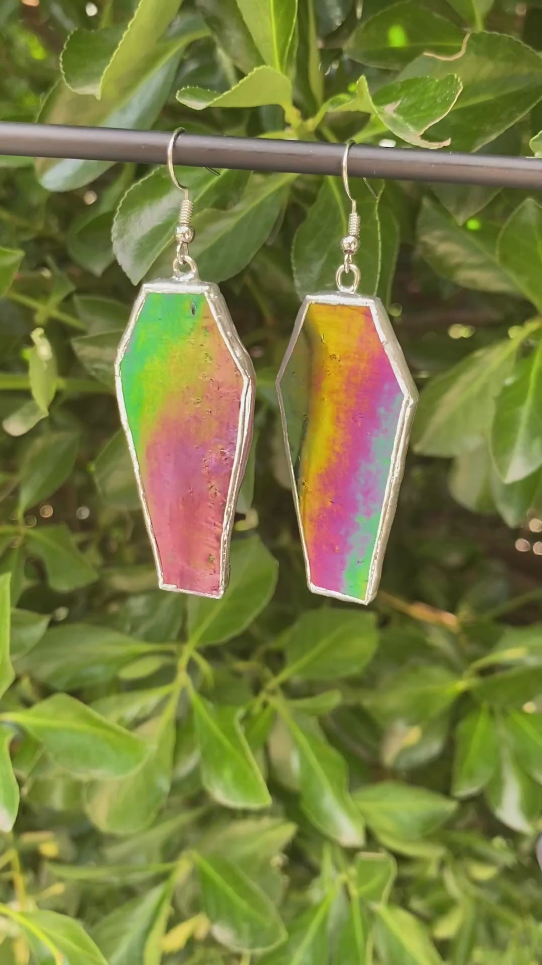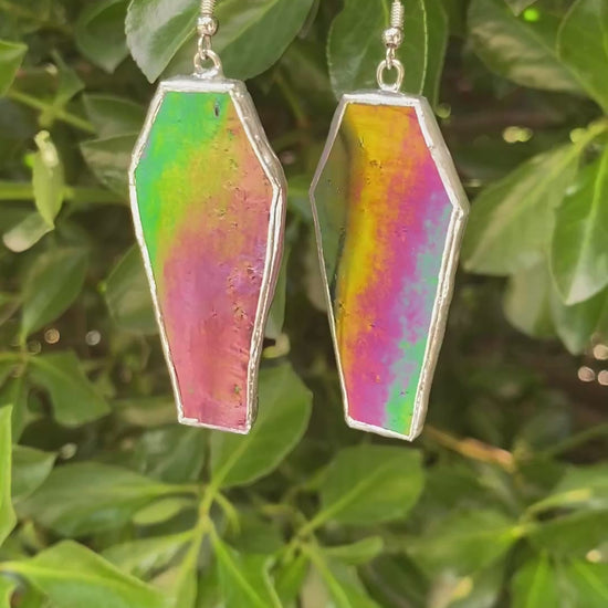 These Large Coffin Earrings sparkle with metallic iridescent glass, adding a playful twist to your spooky style. Perfect for those who love bold, eye-catching accessories with a touch of eerie charm.